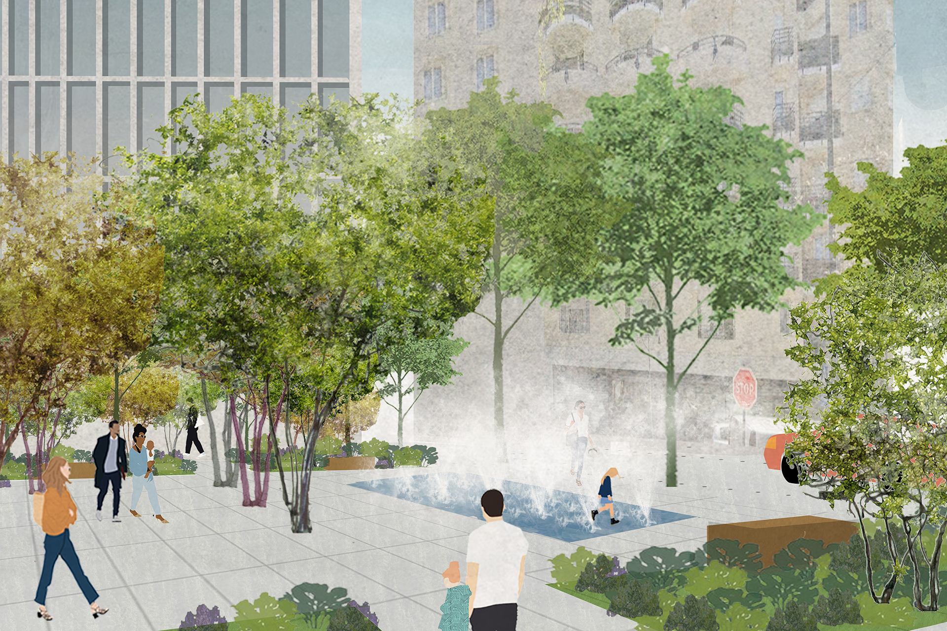 Sur la rue du Bac d’Asnières, le projet propose la réduction de l’emprise de la chaussée et la création d’une zone de rencontre. L’objectif étant de libérer une grande surface de trottoir pour les terrasses de cafés, et de créer une bande végétale large de 7m, en continuité des ambiances boisées du parc. Le trottoir, d’un revêtement de sol continu, s’ouvre sur une placette, séparée de la voie par un bassin miroir animant le quartier. L’espace est ombragé et polyvalent, et pourra notamment accueillir un marché les week-ends. La rue Pierre Bérégovoy intègre une piste cyclable séparée de la voirie par de larges massifs plantés. L’accès au parc a été repensé en plateau pour sécuriser les traversées piétonnes. Le mur du parc est mis en valeur par la plantation d’arbustes palissés et de plantes grimpantes.